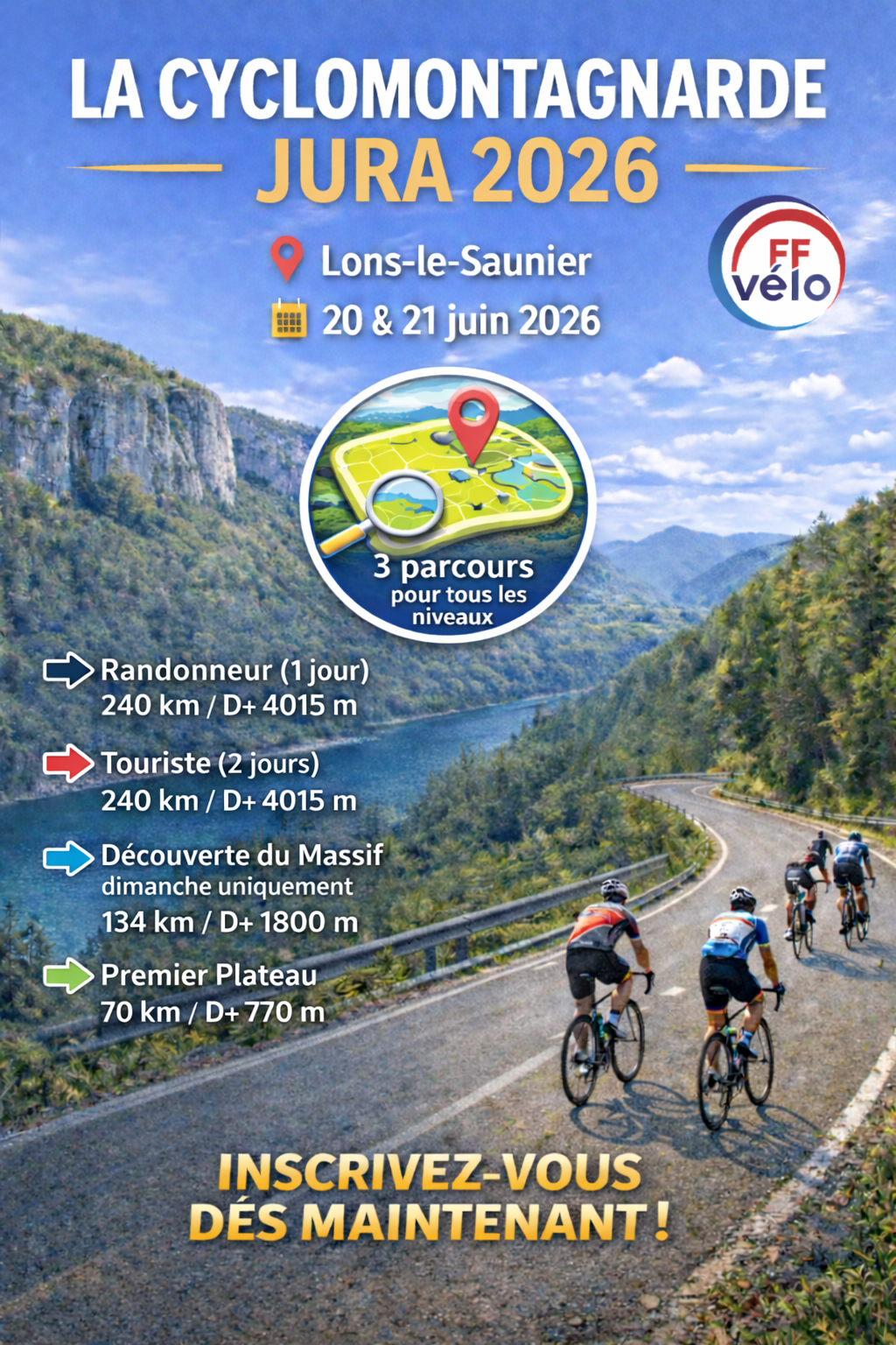 La CMJ CycloMontagnarde du Jura revient pour sa 21éme édition les 20 & 21 juin 2026 au départ de Lons-le-Saunier.