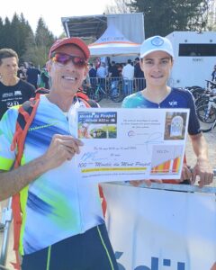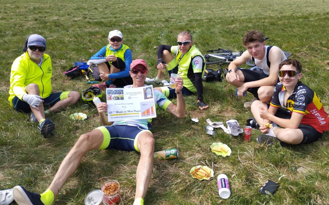 Samedi 18 avril 2026, rendez-vous est donné aux cyclotouristes de PIREY pour aller supporter les coureurs cyclistes professionnels du Tour du Jura avec une arrivée au Mont POUPET (point culminant du Jura externe avec ses 832 mètres d’altitude). Mais c’est également un grand jour pour moi qui profite de cet événement pour fêter ce jour ma 100ème montée de notre petite montagne locale. En effet, depuis mon arrivée au club en 2016 j’ai découvert ce site et jusqu’en 2020, nous faisions avec le club 3 ascensions annuelles, plutôt en été (!!!) lorsque les jambes ont cumulé un peu de dénivelé. En 2020 (effet Covid ou pas ??), je me suis alors fixé pour objectif de faire une montée par mois. Le Mont POUPET est beau, sauvage à toutes saisons. Il m’est arrivé de faire les deux derniers kilomètres sous 2 cm de neige. Pour monter même sans vélo Gravel ça passait, mais pour redescendre c’était les pieds au sol en chasse neige !!! En 2024 j’ai même eu l’idée un peu folle d’après certain(e)s de faire 12 ascensions dans la journée, et ça s’est super bien passé. Aujourd’hui en ce jour de 18 avril 2026, je suis heureux de faire ma 100ème avec mes amis de PIREY Cyclotourisme. Un incident mécanique à déplorer pour André qui casse son dérailleur (trop fort sur les pédales!!!) et il finit le dernier km à pied. Un pique-nique au soleil, un apéro Macvin du Jura oblige pour fêter cet anniversaire avec modération bien-sûr. Nous suivons les coureurs du Tour du Jura professionnel sur écran géant avant de les applaudir à l’arrivée. Cerise sur le gâteau, je peux même approcher le vainqueur du jour Matthew RICCITELLO (américain de L’ÉQUIPE DECATHLON CMA CGM) qui se prête aimablement à une photo souvenir, et le deuxième Léo BISIAUX (français, également de L’ÉQUIPE DECATHLON CMA CGM) se joint à lui pour une signature. Voilà une bien belle journée de cyclotourisme alliant l’effort, l’amitié, la passion du vélo.